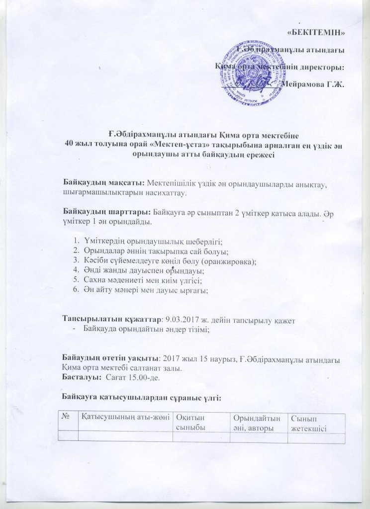 Ғ.Әбдірахманұлы атындағы Қима орта мектебіне 40 жыл толуына орай «Мектеп-ұстаз» тақырыбына арналған ең үздік ән орындаушы атты байқаудың ережесі